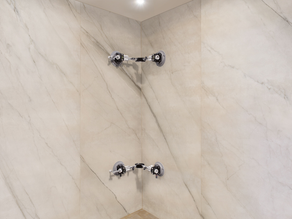 Přípravek pro lepení kolmých spojů bez nutností použití dalších pomůcek. 90°STEALTH SEAMER je jediný přípravek na trhu, který můžete použít i na lepení vnitřních rohů jeho prostým otočením. Přísavky mají označení "non-marking" s funkcí FTS neboli pružným trojitým těsněním. Toto řešení poskytuje maximální přilnavost i na zdrsněných površích, jako je například broušený povrch, tzv. Leder efekt apod. Plynule otočné válečky umožňují sesazení materiálů dohromady a díky nastavovacím podpěrám docílíte přesný spoj pod úhlem 90°. Integrovaná proti-tlaková jednotka pomáhá překonat případné výkyvy materiálu. Snadno čitelné indikátory umožňují sledovat stav podtlaku přísavek na první pohled (červený indikátor) a přísavky lze podle potřeby kdykoliv natlakovat. To je velká přednost oproti přísavkám se šroubovacími knoflíky nebo páčkami. Nosnost jedné přísavky je 22 kg. Přípravek 90° STEALTH SEAMER MANUAL se prodává samostatně a nedoporučuje se používat na porézní nebo těžké visící kusy (pro tyto případy doporučujeme verzi AUTO).