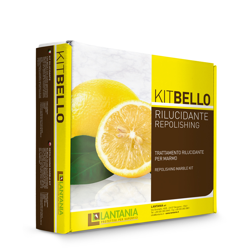 KIT BELLO je sada vyvinutá pro jednoduché použití na opravu přírodního lesku na mramoru. Tato sada umožňuje obnovit jas mramorového povrchu, poškozeného působením citronu, vína, pomeranče nebo jiných druhů kyselin obecně. Výrobce upozorňuje, že v případech oprav nemusí být vždy výsledek 100%, jelikož kámen je přírodní materiál a je zde mnoho faktorů, které mohou výsledek ovlivnit.